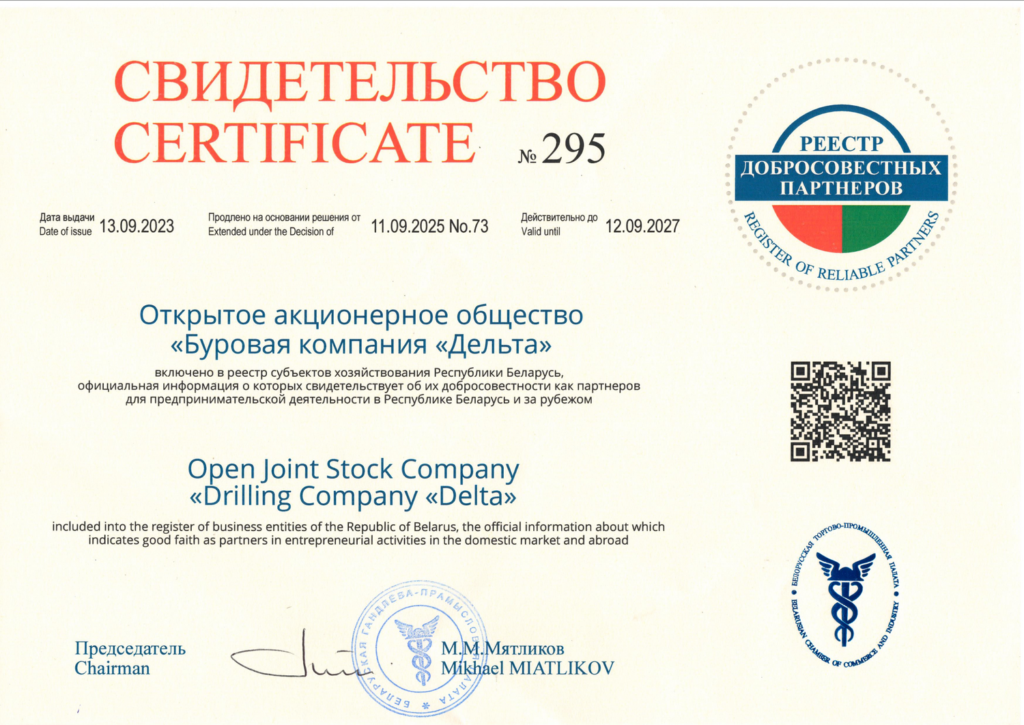 Свидетельство "О включении ОАО "Буровая компания "Дельта" в реестр субъектов хозяйствования Республики Беларусь, официальная информация о которых свидетельствует об их добросовестности как партнеров для предпринимательской деятельности в Республике Беларусь и за рубежом".